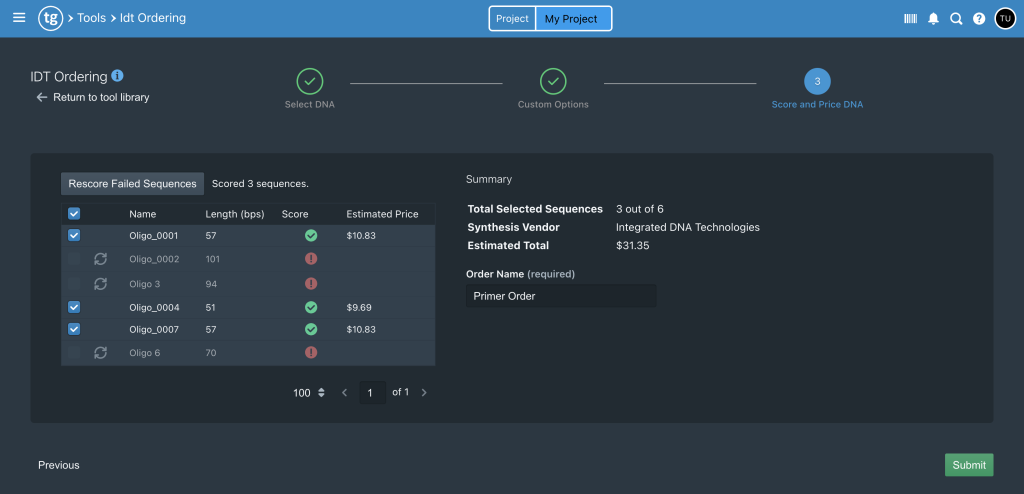 TeselaGen’s platform is integrated with IDT’s ordering system, allowing researchers to: