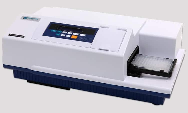 The SpectraMax Plate Reader from Molecular Devices is a versatile instrument designed to perform a wide range of assays—including UV/visible absorbance, fluorescence, luminescence, fluorescence polarization, and time-resolved fluorescence (TRF) assays. Its dual monochromators enable spectral scanning in 1 nm increments, providing optimal flexibility for assay design.